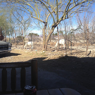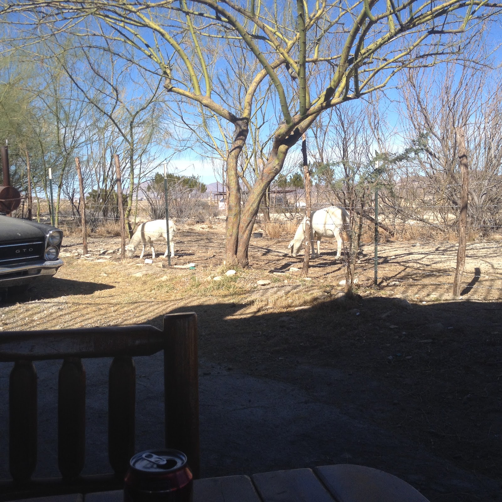 We headed to the entrance near Maverick Junction to exit the park and drove to Terlingua for lunch. We found out the burger special did not start until 5:30 but we got a recommendation for a good place for lunch. We sat outside on the cool, shady patio. We could see sheep grazing from our table and there were two dogs outside with us. They seemed to be regulars because everyone coming and going knew their names. Our waitress suggested the fajitas and cheeseburgers as her favorites so we went with that. The food was delicious especially the guacamole with my fajitas. Full and happy we drove back to camp to pack up as much as possible before the sun set.