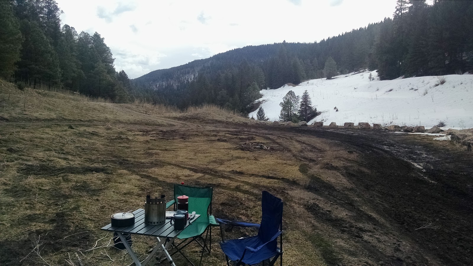 After breakfast, we headed up the nearby hill to look for firewood. There was quite a bit of snow on the ground especially in shadier areas. We happened upon a campsite with lots of firewood, including some nice big cut logs. We rolled them down the hill and picked them up on our way back to our campsite. The temperature started dropping and the wind picked up so we were happy to have lucked into a good supply of wood.