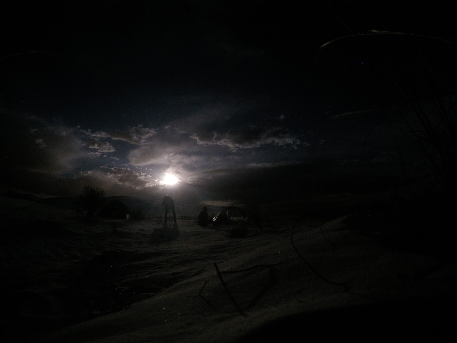 We left the rain fly off the tent so we could have a clear view of the moon and stars all night. It was a little chilly but worth it. The full moon made the sand really bright. Francis got up several times during the night to take more pictures.