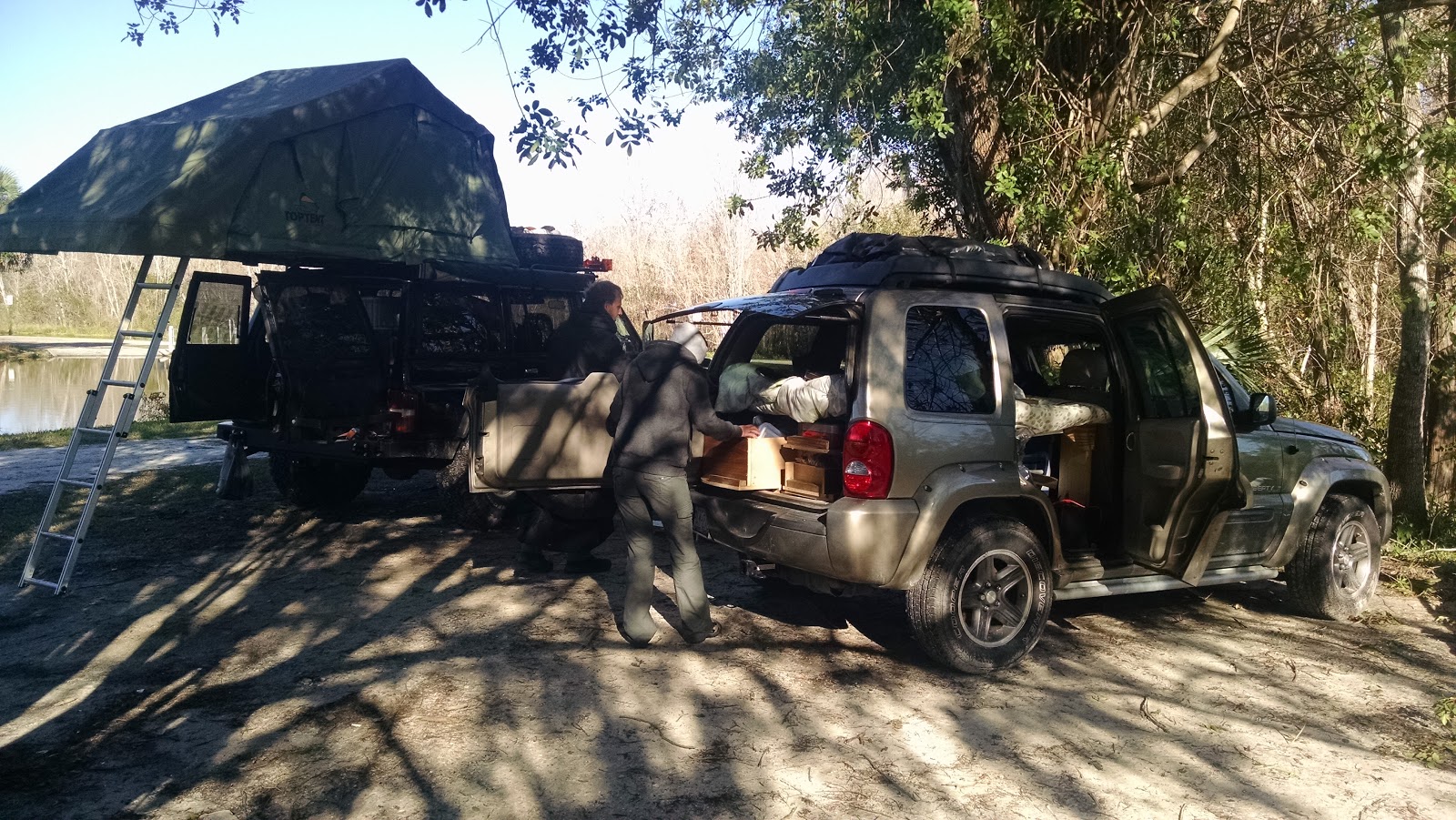 We woke up to the heavy rain the forecast had called for. We climbed out of the car in our raincoats and made coffee under Greg’s canopy. The canopy pulls out from the side of his truck and even has LED lighting. His truck is loaded with bells and whistles including drawers, a hot shower, a tent on the roof, a refrigerator and much more. He prepared it for this trip while he was in Poland and had it shipped here. Francis was pretty proud of how he set up our jeep with the bed and freezer under it until he saw Greg’s. He now has lots of ideas for modifications for our next trip. As nice as the canopy is, it is a bit small for 4 people to spend a day under as the rain intensified. We decided to go to town to have lunch and run some errands. We figured the best bang for our buck was to try an Asian buffet in Vero Beach. All you can eat for around $7 sounded good to all of us. It was Greg’s and Beata’s first experience with this kind of dining. Beata went for the sushi, I went for lots of different veggies and the guys loaded up on meats. Somehow we even managed to save a little room for dessert.We were all very happy and very full by the time we finished.We went back out into the pouring rain and headed our separate ways to stock up on some supplies with plans to meet up at the local Starbucks to use the internet to plan our next stop. As Francis and I got seated, an older Caucasian gentleman got my attention and said, “Hey can I ask you something?” He proceeded to take of his cap and show me his head of short, sparse white hair. I was pretty confused until he pointed to Francis and said” How do you think I would look with my hair like his? That’s what you call show off hair.” We laughed of course and I assured him that his hair looked just fine. Happily the sun came out while we were in Starbucks so we headed back to camp. None of us were the least bit hungry for dinner after our huge lunch but our Polish friends had purchased marshmallows at Walmart so we got the campfire going and got to roasting. After trying a few, we all agreed that the Polish custom of sausage and beer was more to our liking.