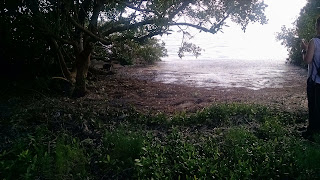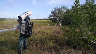 We headed to the trailhead to start our hike. We loaded up our gear and put on plenty of bug spray and some bug repellent patches I found at REI that were supposed to work for 36 hours. The trail started out ok other than some slippery mud in places. Not long into the hike, things took a turn for the worse. The trail was indeed covered in water up to our ankles or higher. We tried walking off the trail but the plant growth was tall and hard to walk through. It was slow going to say the least and the mosquitos were biting. After about an hour, we checked our progress on the GPS and realized we had only gone 1 mile of the 6 mile trek. We decided to walk for another 30 minutes to see if the trail got any better then make a decision about whether to turn around. The trail in fact only got worse. Realizing how late it would be before we made our camp and with sunset only a couple hours away, we decided to make our way back. We took a different route back that was under tree cover and a bit drier. It had a nice view of the water, not sure if it was the Gulf of Mexico or the ocean.