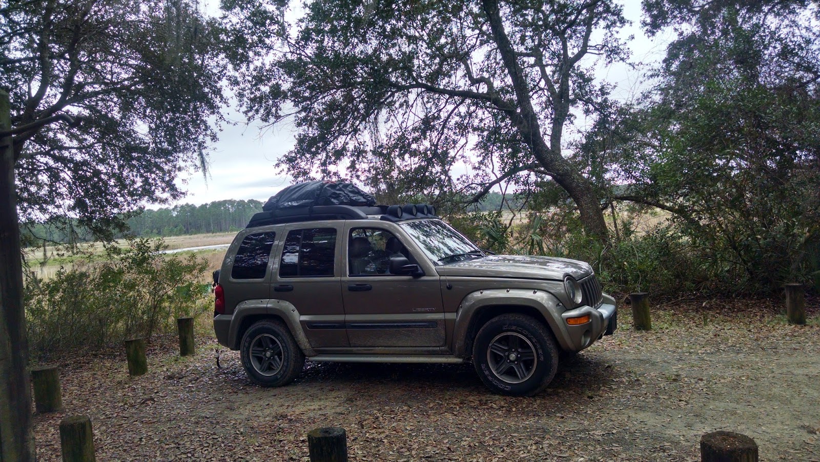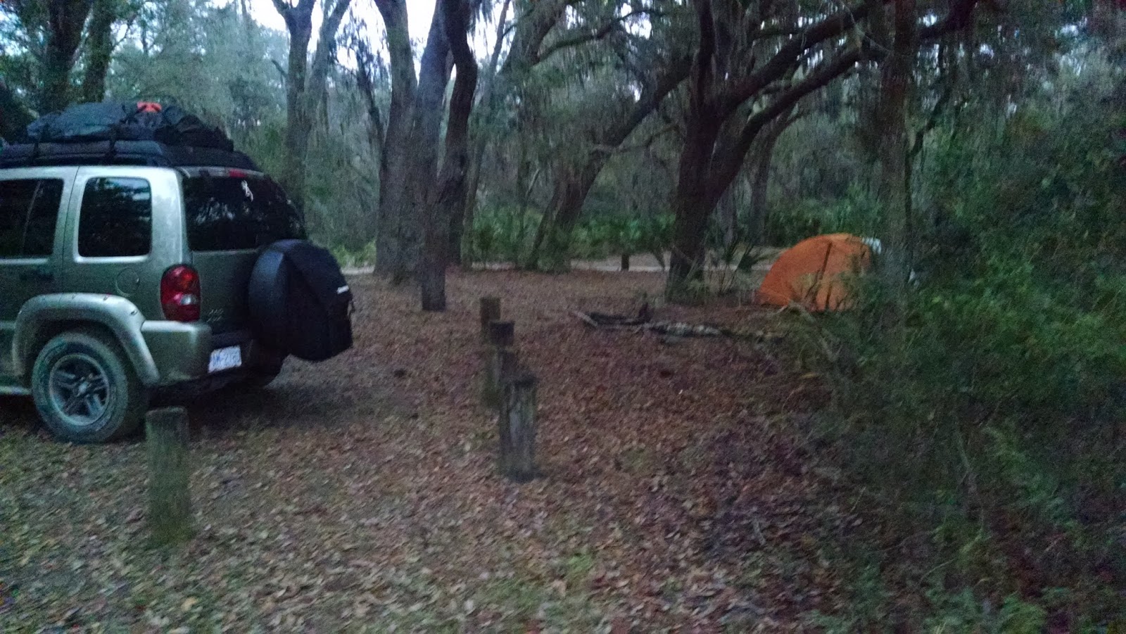 On our way to search for early morning coffee, we saw the sign to Hopkins Prairie we should have taken the night before. We pulled in and talked to a local who told us the campground was 3 miles down the road and told us where to get coffee (the latter was actually more important to me at that moment). While getting coffee, we talked to a ranger and he recommended Lake Delancy. We drove out there and met the camp host and some volunteer workers. We told them our plan to stay until Monday and they ironically recommended Hopkins Prairie as the best place for us. We stopped at the grocery store for supplies then we headed to the campground. It is a beautiful place and the price was right( only $5 a night with our interagency pass)! It was a little cloudy and cool but much better than where we came from. Only a few of the sites were taken so we had plenty of places to choose from. We picked a spot that would hopefully give us plenty of sun for our solar panels. In the evening we ran into a friendly young man named Eugene and his Husky/Collie mix named Bosley. He shared some stories with us of his experiences in the military. He volunteered to scavenge some wood for us on the nearby Florida Trail because the campsites were pretty well picked over. He and Francis went out and returned with bunches of wood. After relaxing around the fire for awhile, we thankfully headed to bed in our tent. The car comes in handy but the tent is a lot more comfortable.